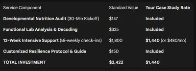- The Work: We implement the GF/Soy-free/Seed-oil-free protocols. We start the "Gut Seal" process using bone broths and fermented foods to repair the intestinal lining.